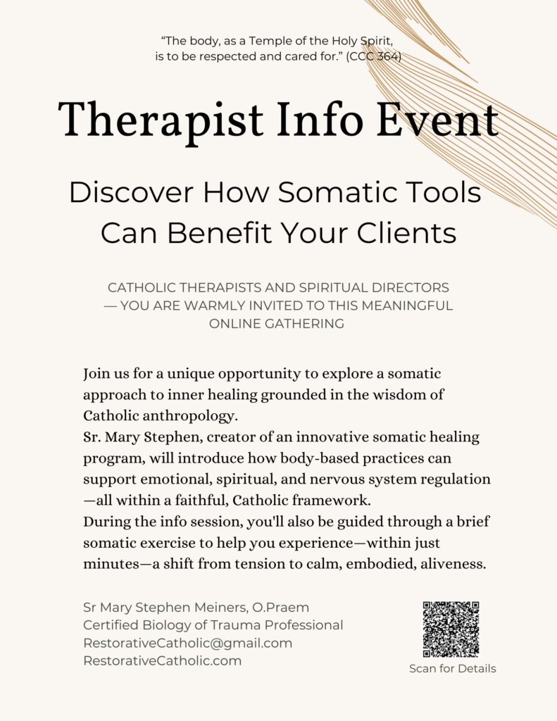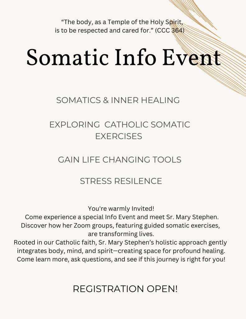 Experience somatic exercises with Sr. Mary Stephen and discover whether this embodied approach to inner healing resonates with you. It’s a beautiful opportunity to get to know her and explore the healing potential of body-based prayer and presence.