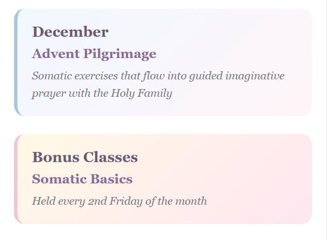 Sr. Mary Stephen accompanies you through faith-based somatic practices, engaging themes that are revisited and deepened throughout the year.
