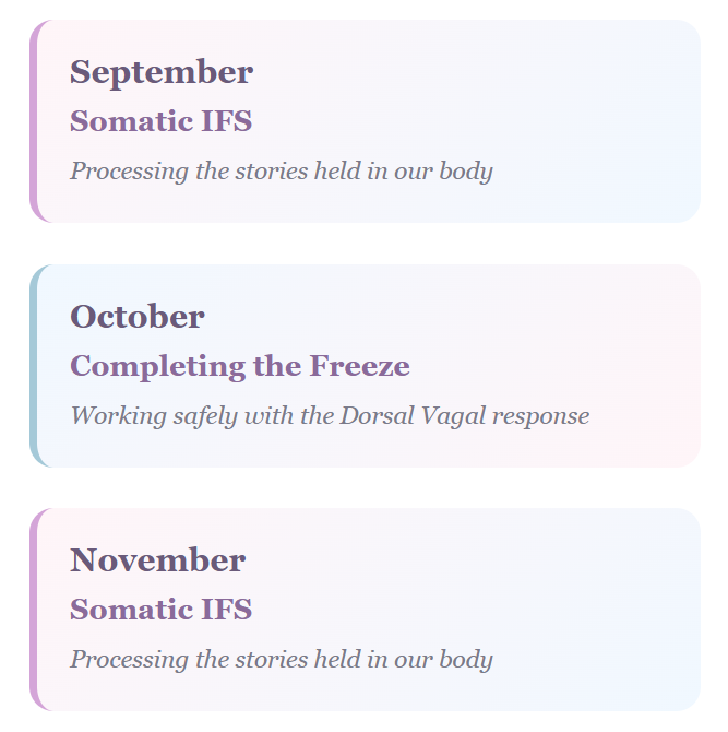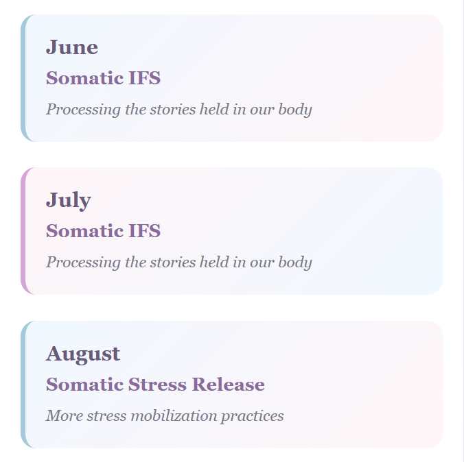 You may join for as many months as feel helpful and step away whenever needed. These classes are designed to support your healing journey, for as long—or as briefly—as feels right for you.