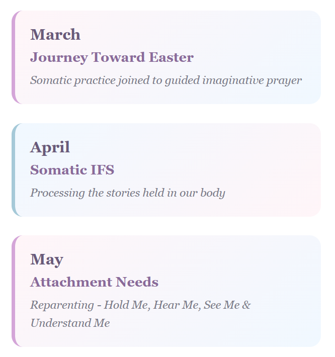 A Catholic somatic approach to inner healing, integrating faith and embodied practices to gently process trauma and stress held in the body.